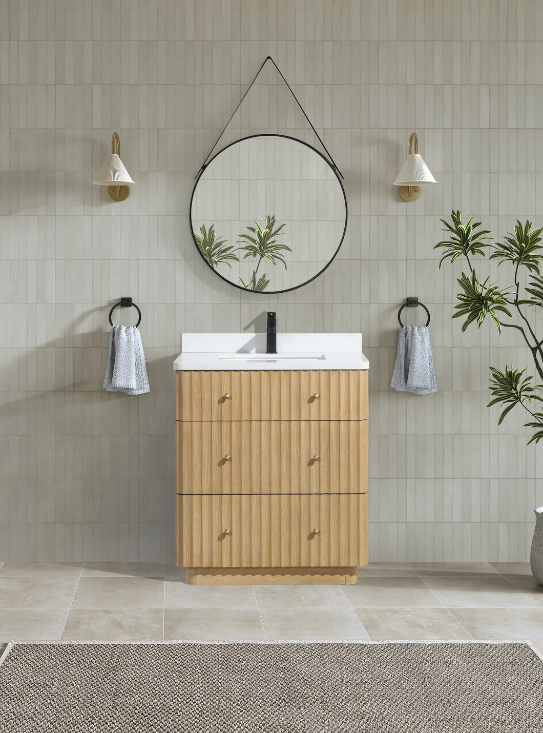 The La Jolla bathroom vanity seamlessly blends natural beauty with modern functionality. Made from solid wood and topped with a quartz-engineered countertop, it showcases a beautiful washed oak finish for a rustic, earthy appeal. The soft-close dovetail drawer offers generous storage for your bathroom essentials, enhancing both the practicality and elegance of the design.