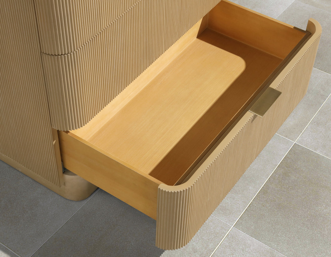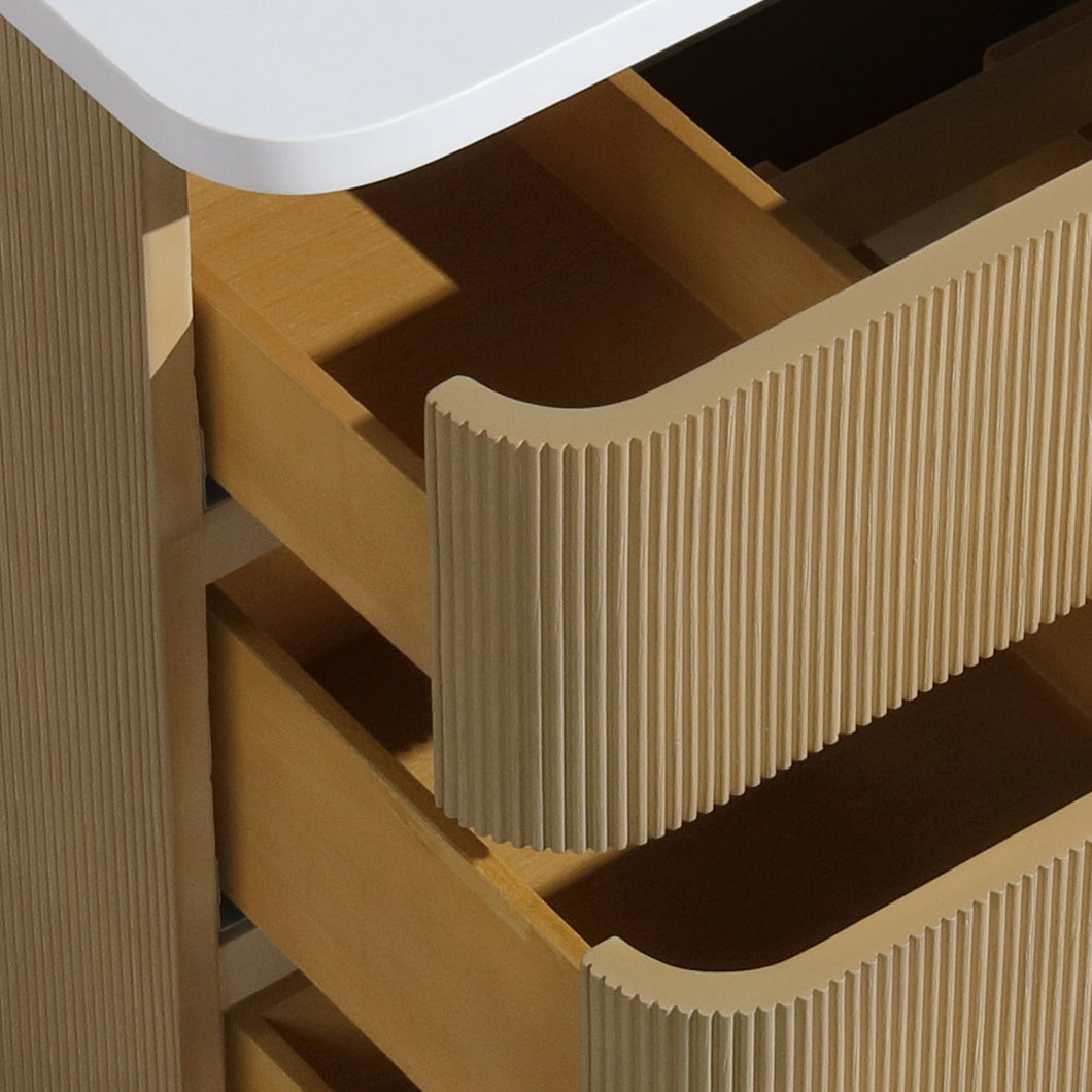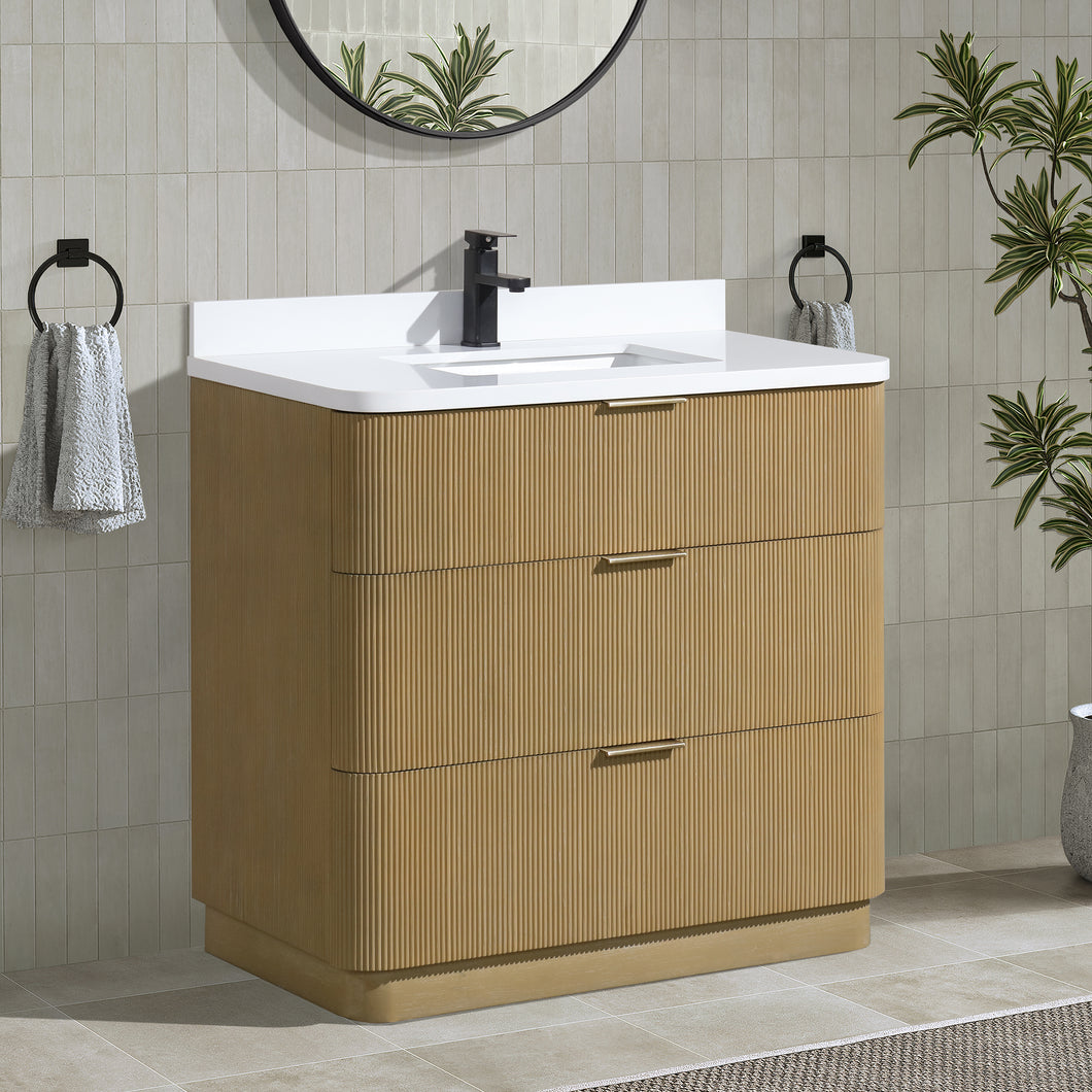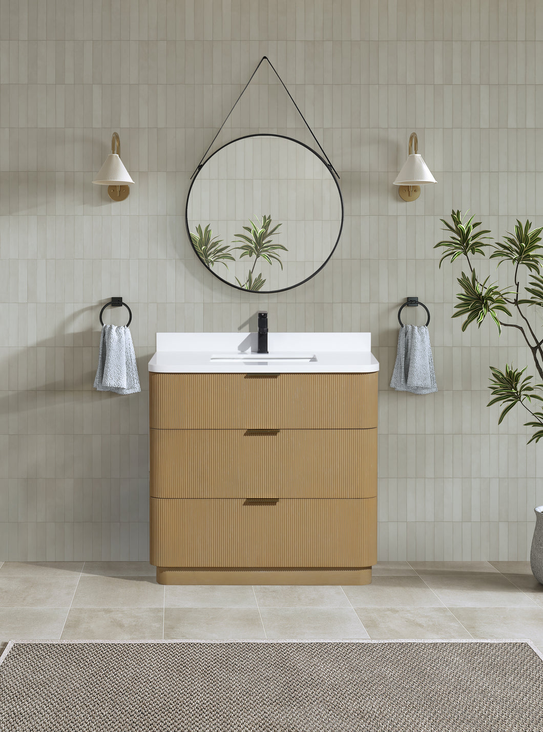 Elevate your bathroom with the 36-inch Calamigo bathroom vanity, designed to be the centerpiece of your remodel. Expertly constructed from solid wood, this vanity is built to last for years. Its raised grain finish adds a distressed, reclaimed charm to the piece. Three spacious, solid wood dovetail drawers with full-extension glides offer plenty of room for your everyday essentials. The fluted drawer fronts enhance the texture and beautifully highlight the natural wood grain, making this vanity both functional and stylish