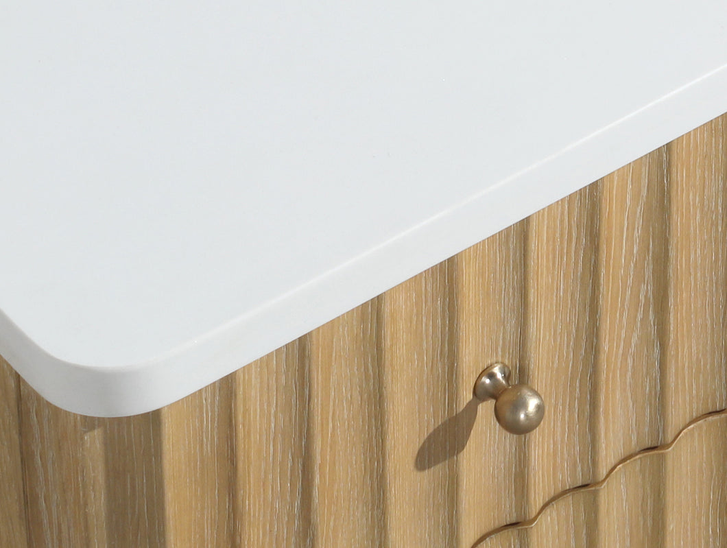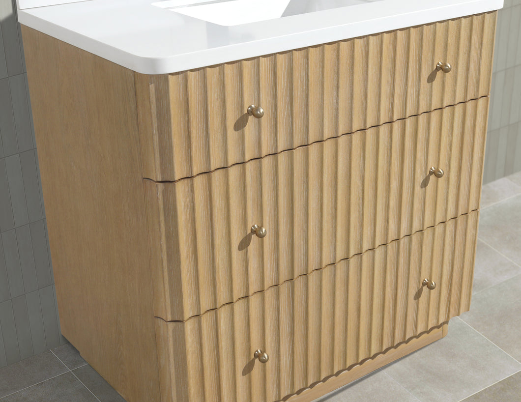 The La Jolla bathroom vanity seamlessly blends natural beauty with modern functionality. Made from solid wood and topped with a quartz-engineered countertop, it showcases a beautiful washed oak finish for a rustic, earthy appeal. The soft-close dovetail drawer offers generous storage for your bathroom essentials, enhancing both the practicality and elegance of the design.