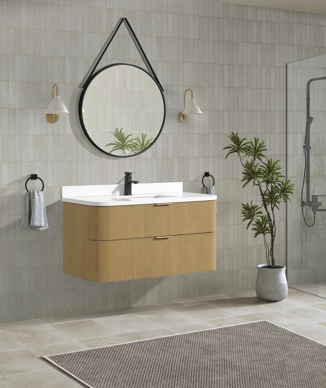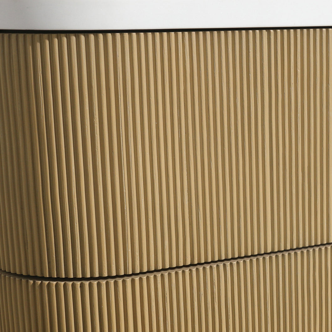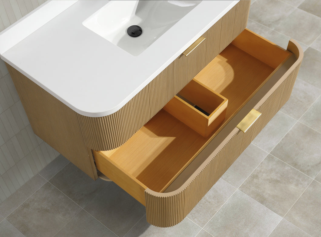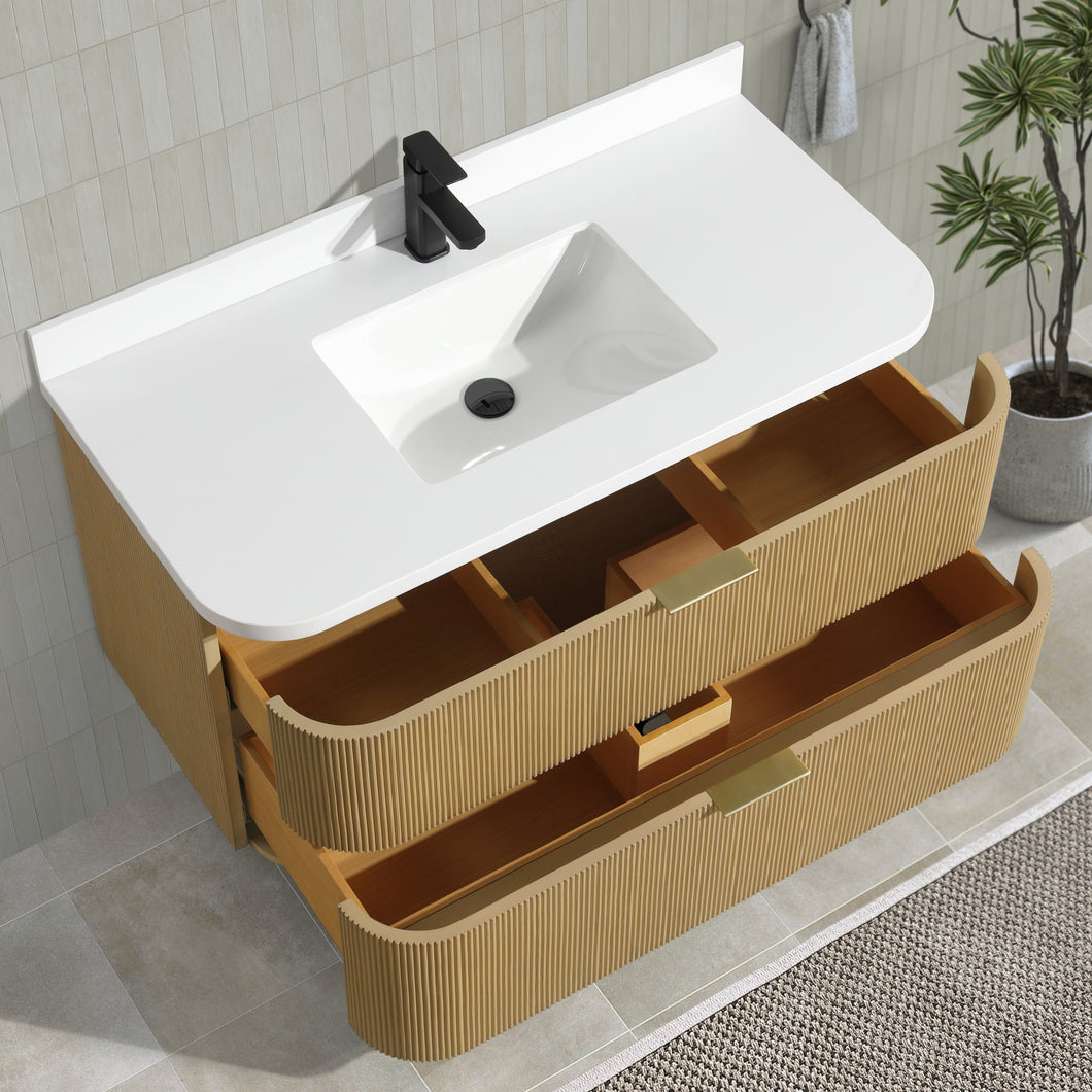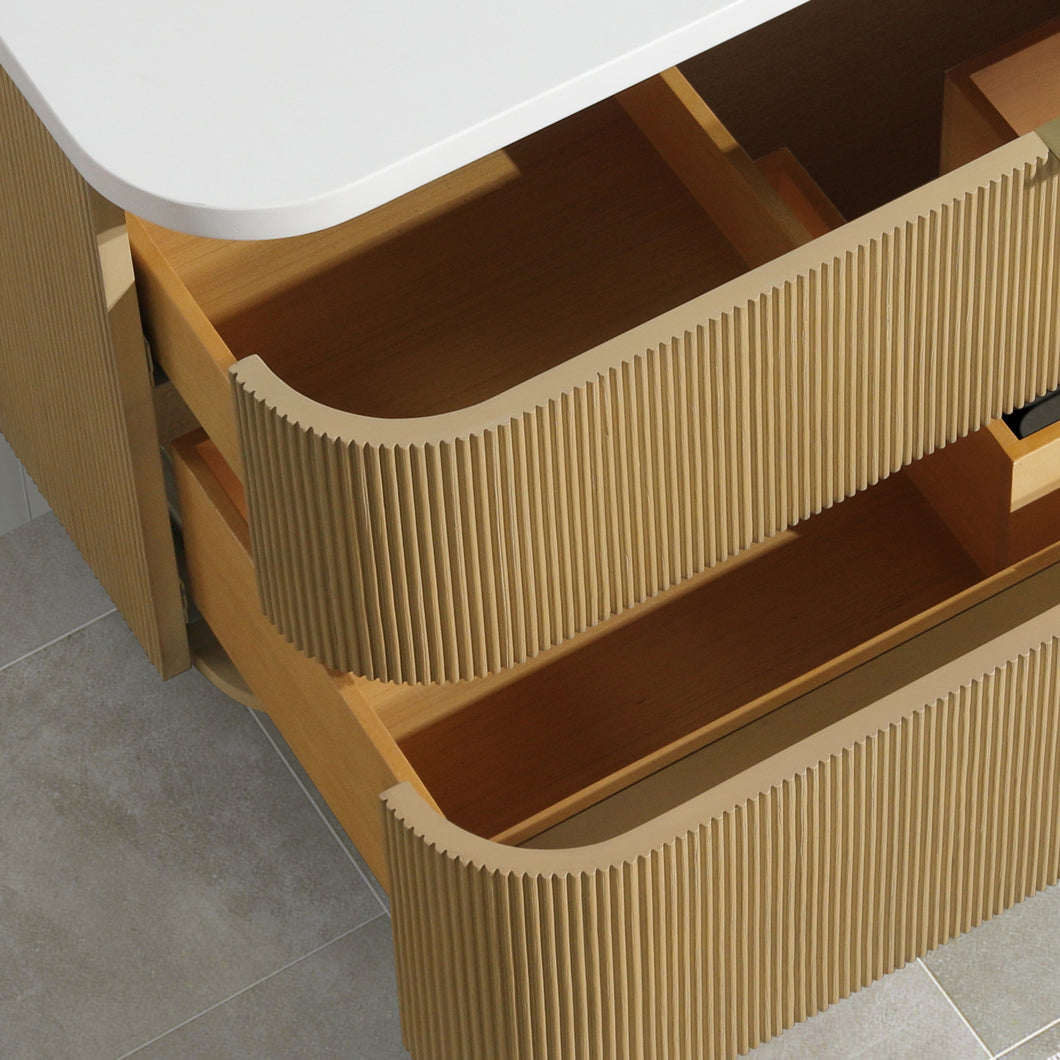 The softly rounded silhouette and vertical wood grain detailing add subtle sophistication, while the floating installation creates an airy, uncluttered feel—perfect for both contemporary and transitional bathrooms. The integrated white countertop offers a seamless, easy-to-clean surface, complementing the warm oak tones for a calm, spa-inspired aesthetic.