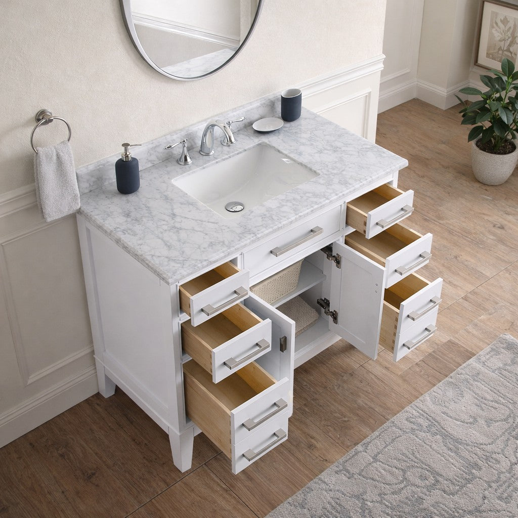 Make a statement in your bathroom with this 42-inch Transitional Bathroom Vanity, where classic elegance meets modern design. Finished in a crisp white and topped with a stunning Carrara marble countertop, this vanity instantly elevates your space with a clean, sophisticated look.