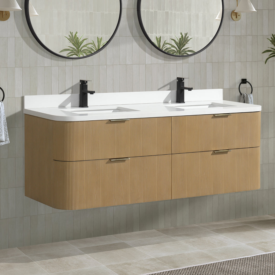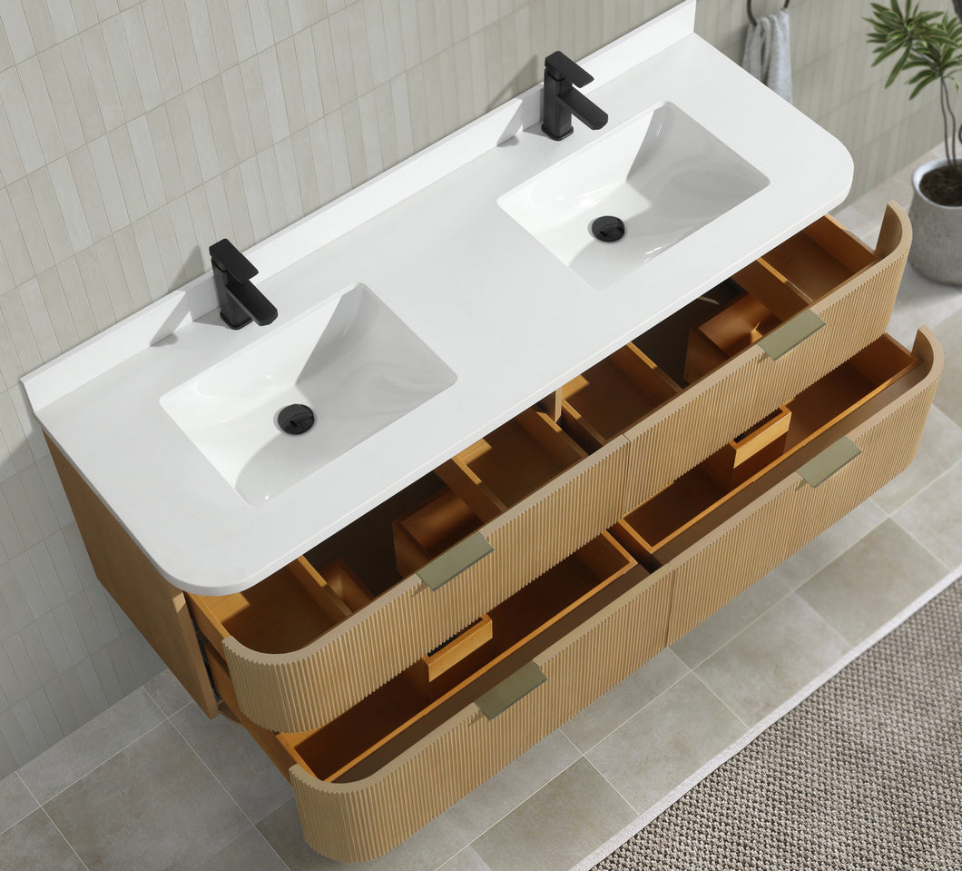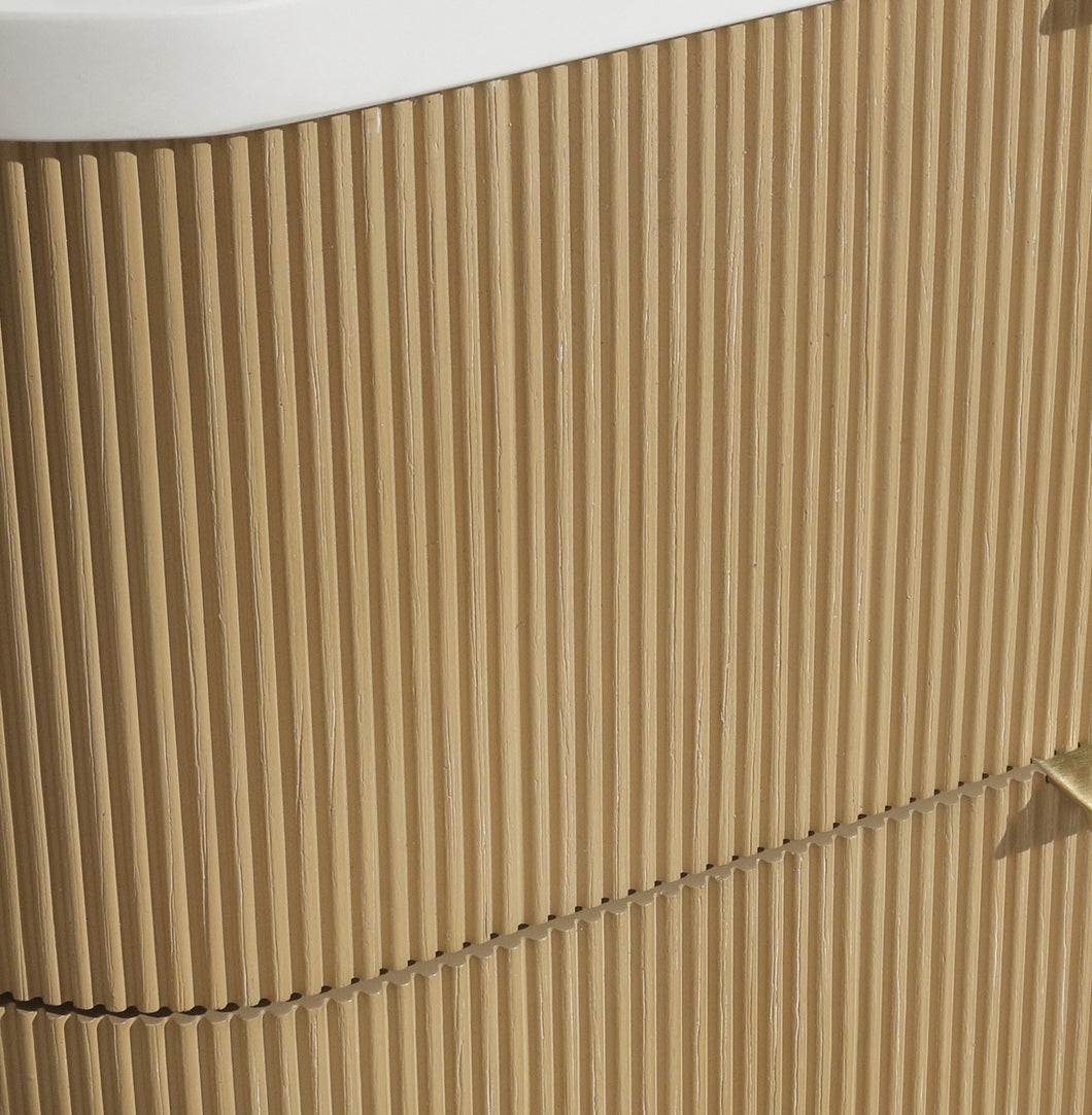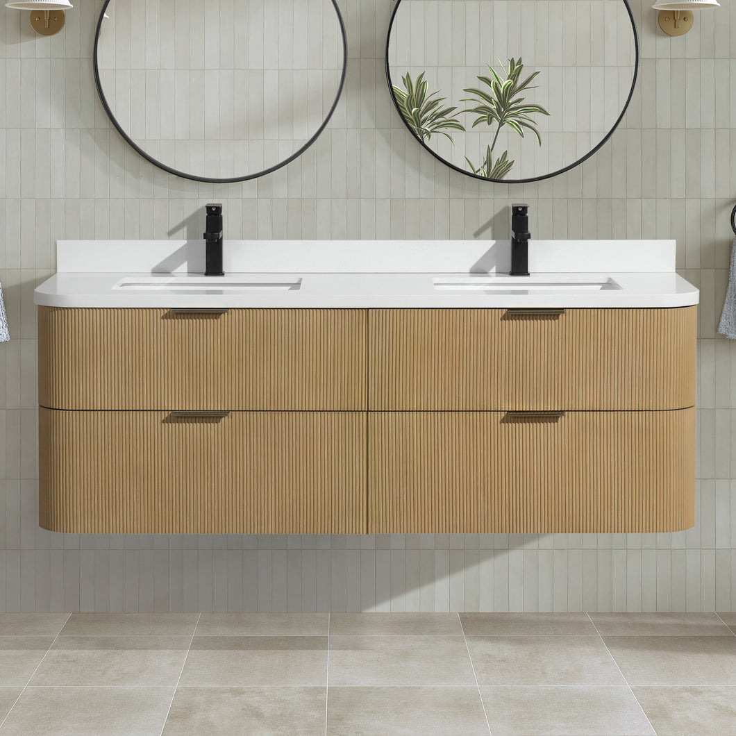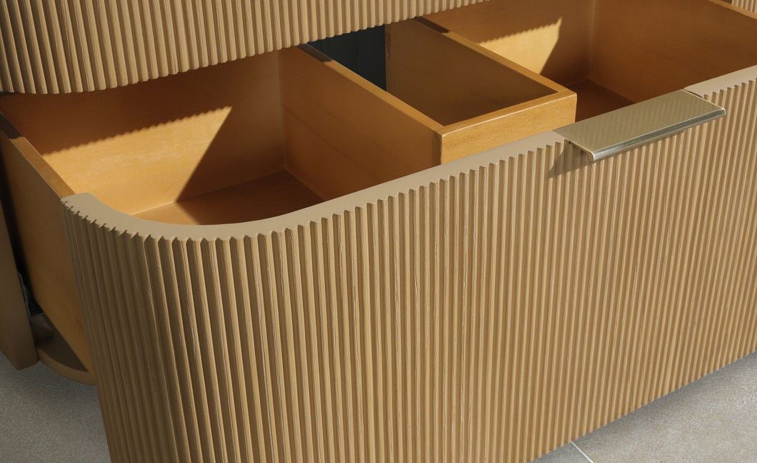 Elevate your bathroom with the 60-inch Chantal bathroom vanity, designed to be the centerpiece of your remodel. Expertly constructed from solid wood, this vanity is built to last for years. Its raised grain finish adds a distressed, reclaimed charm to the piece. Two spacious, solid wood dovetail drawers with full-extension glides offer plenty of room for your everyday essentials. The fluted drawer fronts enhance the texture and beautifully highlight the natural wood grain, making this vanity both functional and stylish